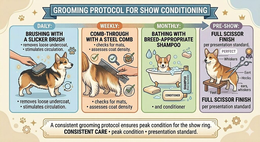 The Corgi coat, when correctly maintained, is one of the breed's most striking features in the ring. Poor coat condition signals nutritional gaps or inadequate grooming management to judges immediately — and once that impression is formed, it is difficult to overcome with movement or structure alone.
